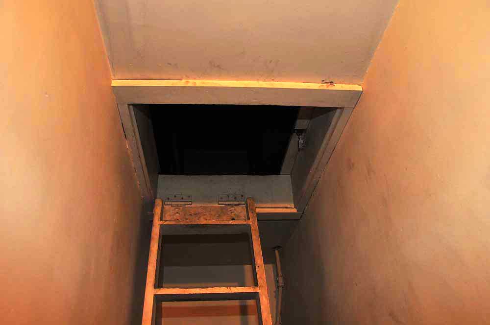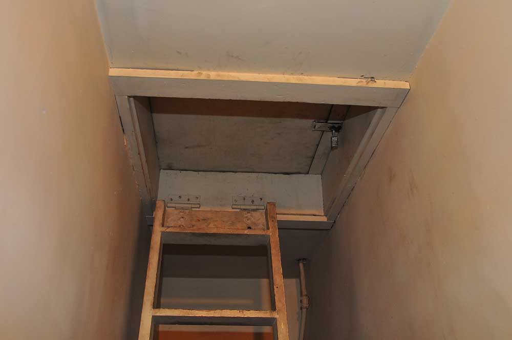 Pull the ladder down. Climb up the ladder. Push the trap door out of your way. Click on the picture on the bottom and we will continue.